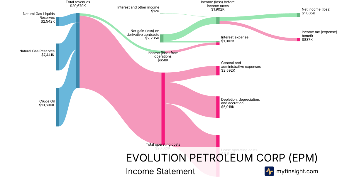For the quarter ending 2025-12-31, EPM made $20,679K in revenue. $1,065K in net income. Net profit margin of 5.15%.