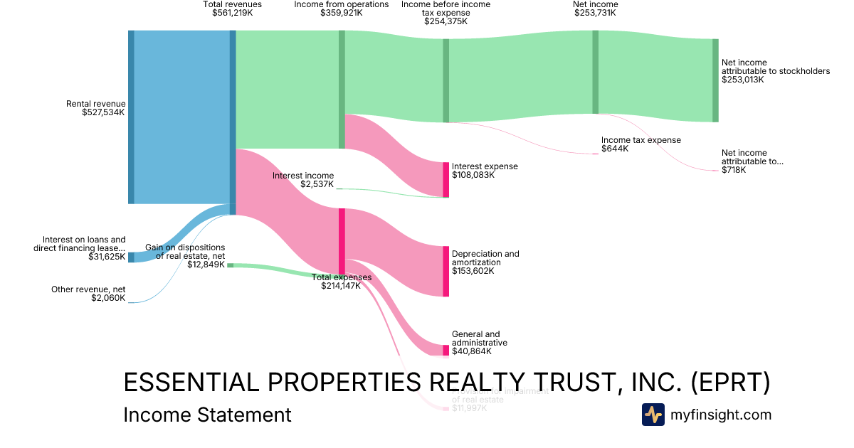 For the year ending 2025-12-31, EPRT made $561,219K in revenue. $253,013K in net income. Net profit margin of 45.08%.