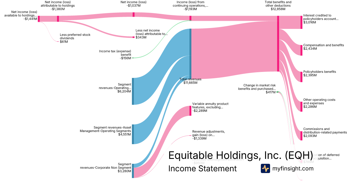 For the year ending 2025-12-31, EQH made $11,665M in revenue. -$1,441M in net income. Net profit margin of -12.35%.