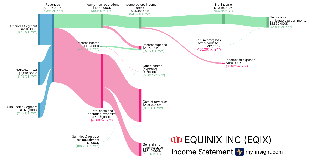 For the year ending 2025-12-31, EQIX made $9,217,000K in revenue. $1,350,000K in net income. Net profit margin of 14.65%.