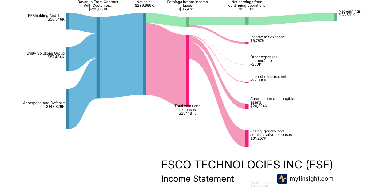 For the quarter ending 2025-12-31, ESE made $289,659K in revenue. $28,691K in net income. Net profit margin of 9.91%.
