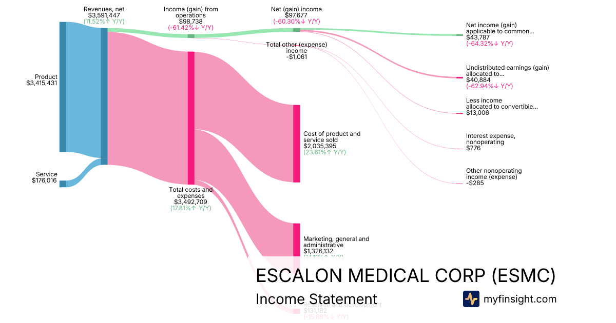 For the quarter ending 2025-12-31, ESMC made $3,591,447 in revenue. $43,787 in net income. Net profit margin of 1.22%.