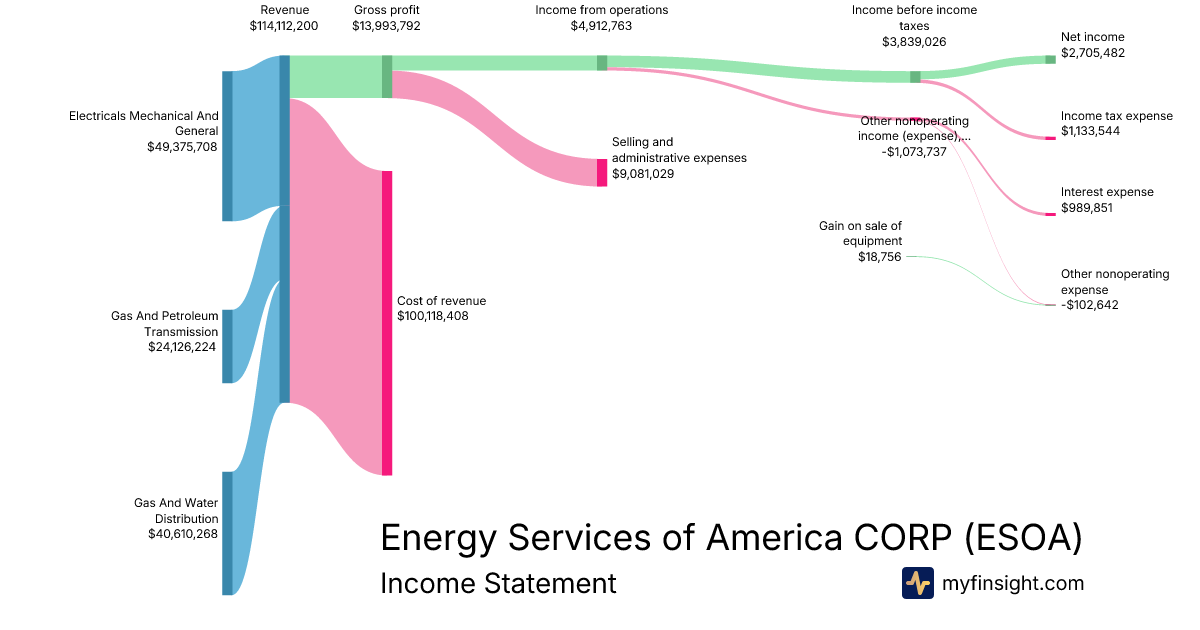 For the quarter ending 2025-12-31, ESOA made $114,112,200 in revenue. $2,705,482 in net income. Net profit margin of 2.37%.