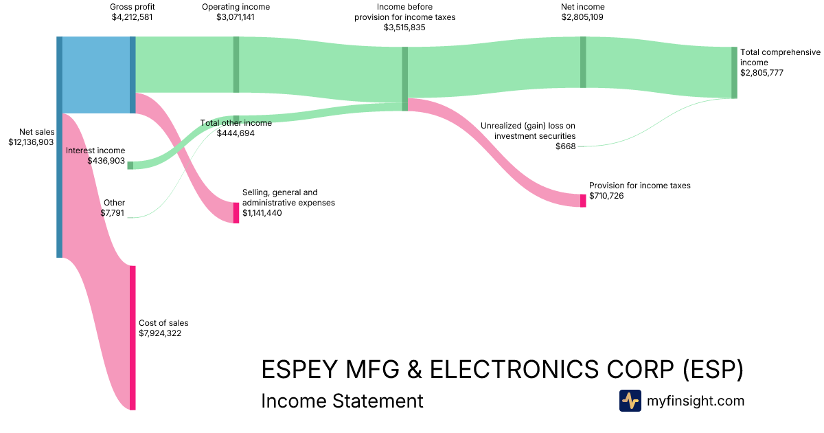 For the quarter ending 2025-12-31, ESP made $12,136,903 in revenue. $2,805,777 in net income. Net profit margin of 23.12%.