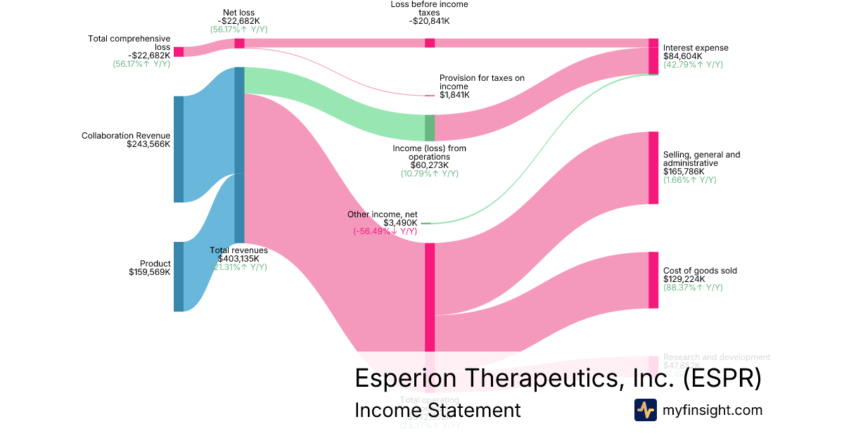 For the year ending 2025-12-31, ESPR made $403,135K in revenue. -$22,682K in net income. Net profit margin of -5.63%.