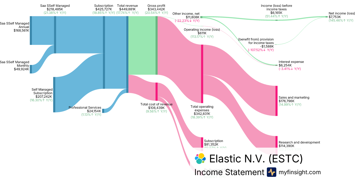 For the quarter ending 2026-01-31, ESTC made $449,881K in revenue. $7,753K in net income. Net profit margin of 1.72%.