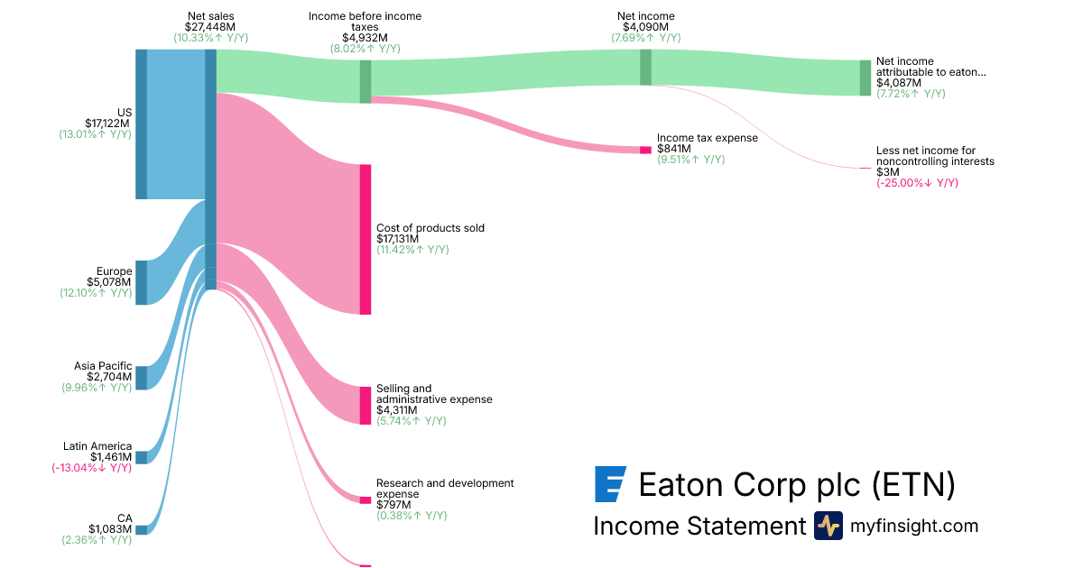 For the year ending 2025-12-31, ETN made $27,448M in revenue. $4,087M in net income. Net profit margin of 14.89%.