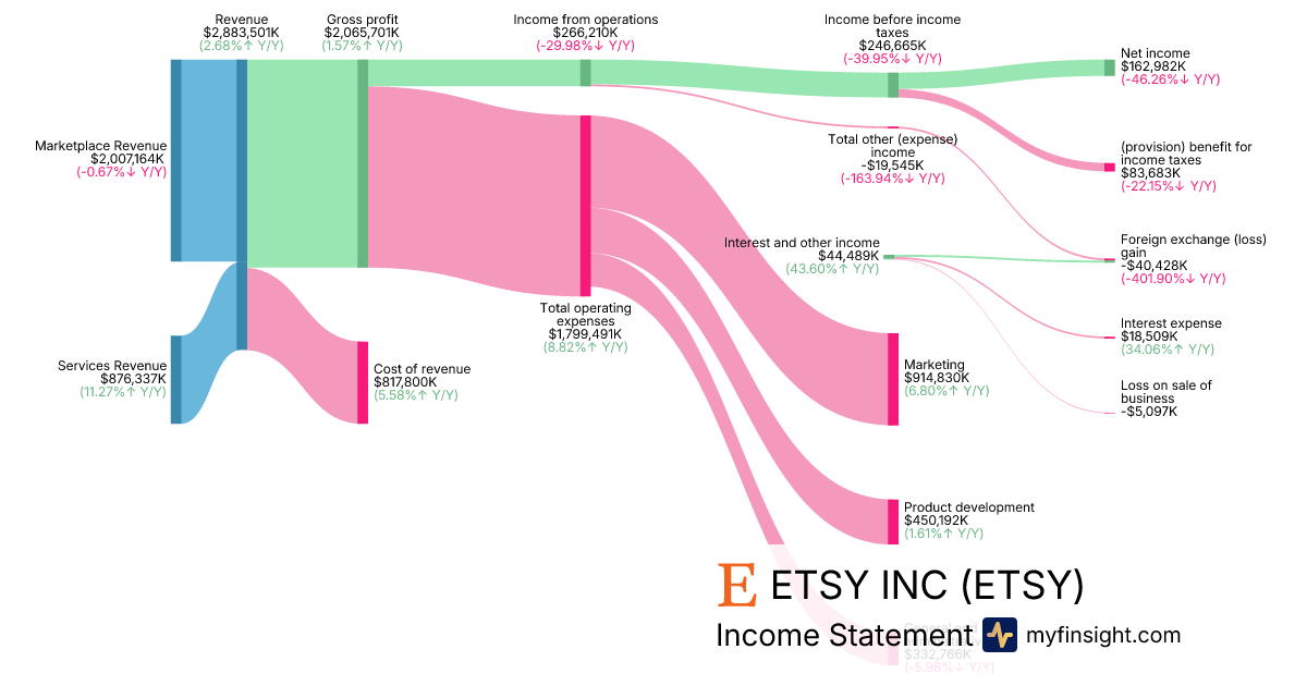 For the year ending 2025-12-31, ETSY made $2,883,501K in revenue. $162,982K in net income. Net profit margin of 5.65%.