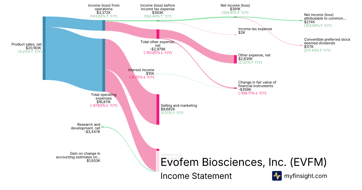 For the year ending 2025-12-31, EVFM made $20,183K in revenue. $274K in net income. Net profit margin of 1.36%.