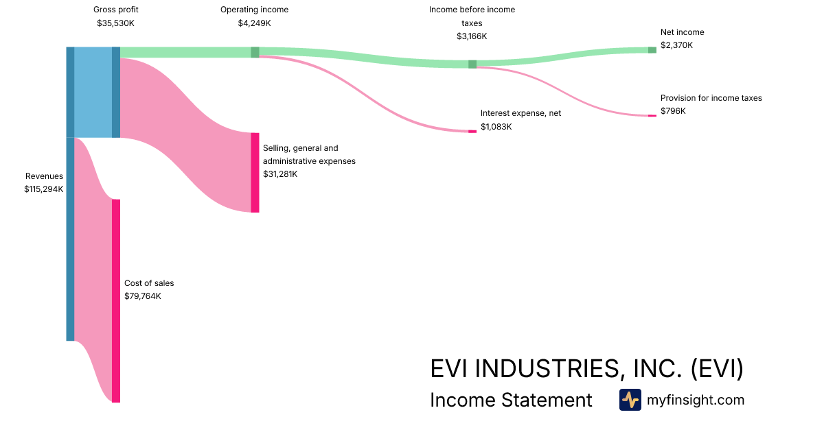 For the quarter ending 2025-12-31, EVI made $115,294K in revenue. $2,370K in net income. Net profit margin of 2.06%.