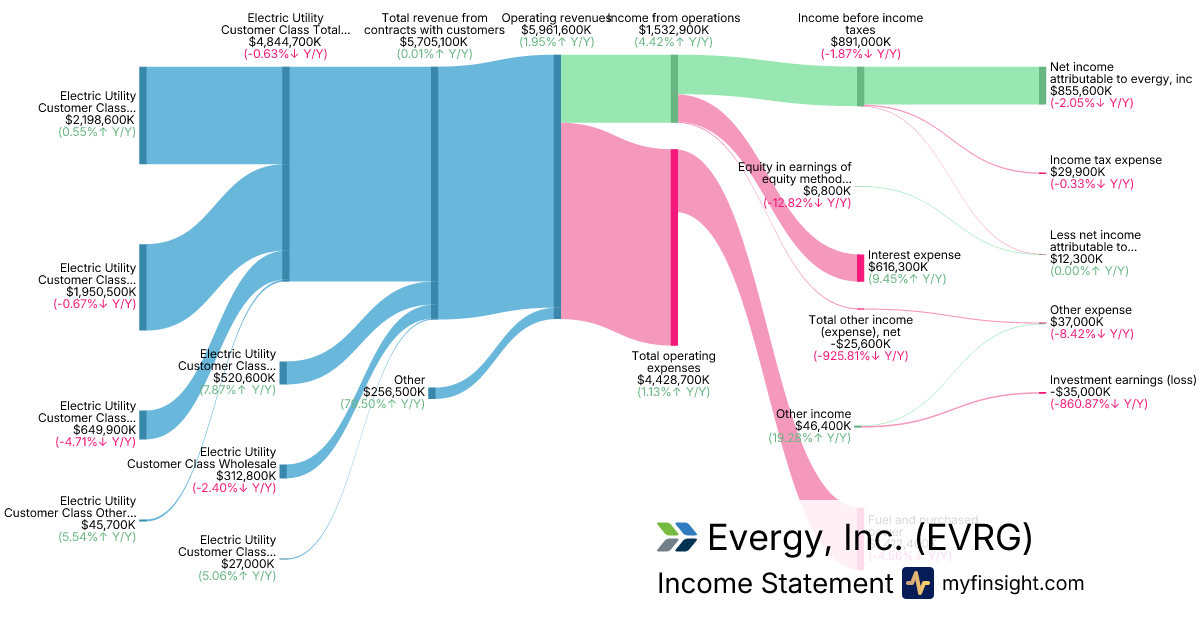 For the year ending 2025-12-31, EVRG made $5,961,600K in revenue. $855,600K in net income. Net profit margin of 14.35%.