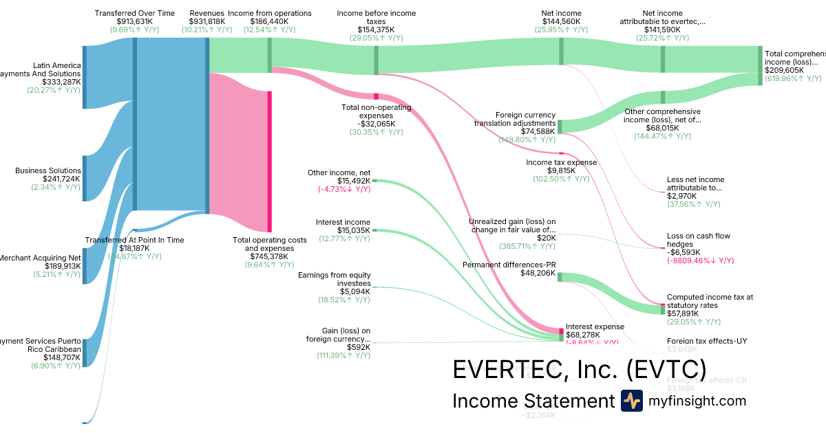 For the year ending 2025-12-31, EVTC made $931,818K in revenue. $209,605K in net income. Net profit margin of 22.49%.