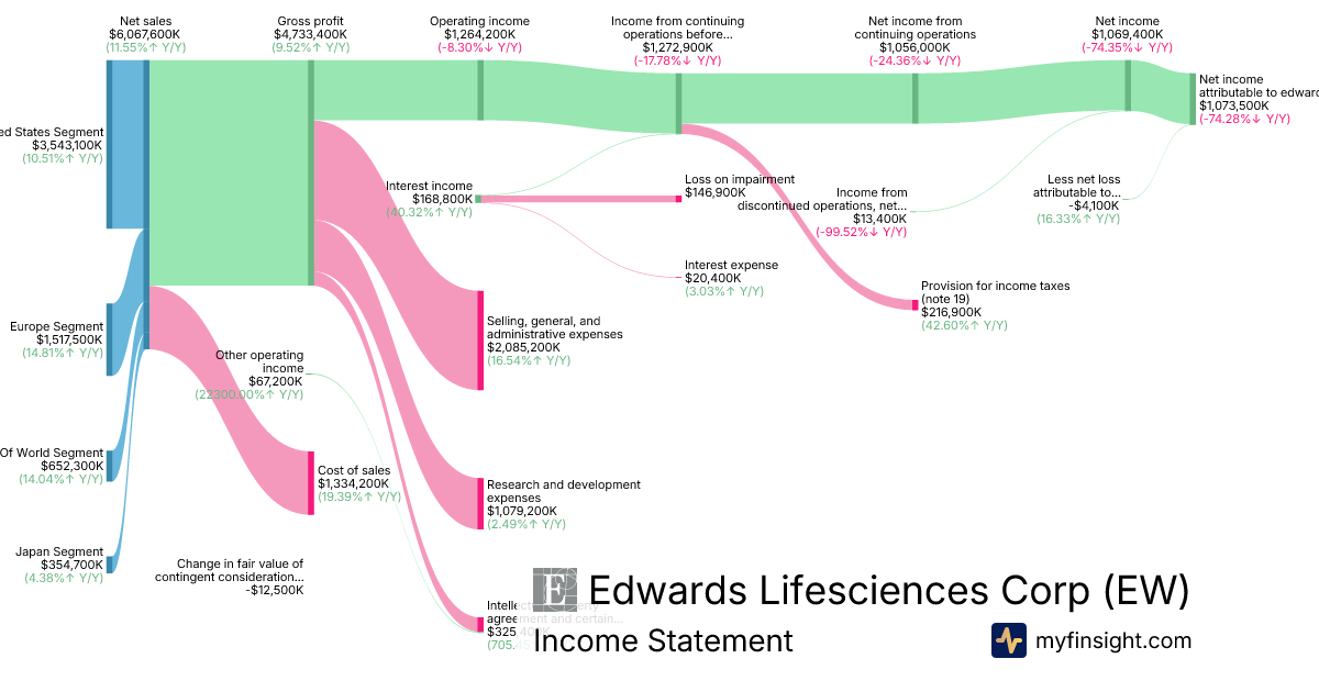 For the year ending 2025-12-31, EW made $6,067,600K in revenue. $1,073,500K in net income. Net profit margin of 17.69%.