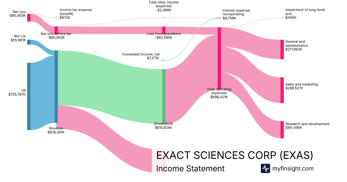 For the year ending 2025-12-31, EXAS made $3,246,990K in revenue. -$207,949K in net income. Net profit margin of -6.40%.