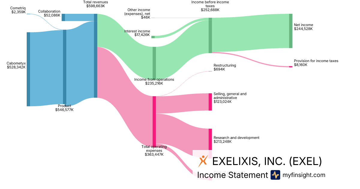 For the year ending 2026-01-02, EXEL made $2,320,126K in revenue. $782,570K in net income. Net profit margin of 33.73%.