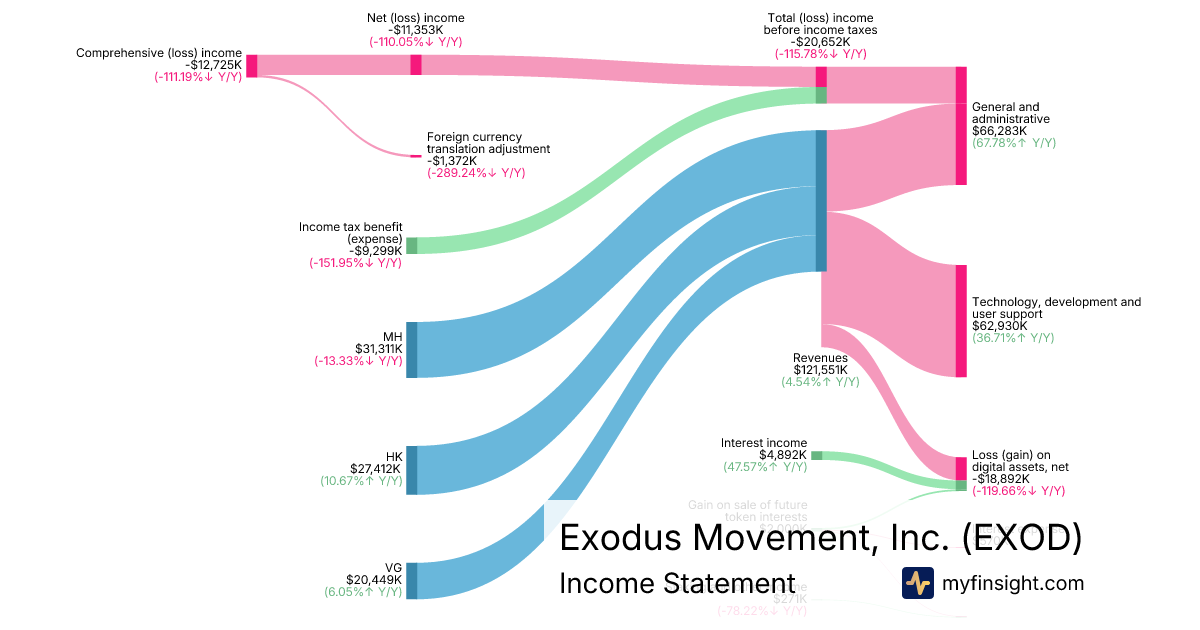 For the year ending 2025-12-31, EXOD made $121,551K in revenue. -$12,725K in net income. Net profit margin of -10.47%.