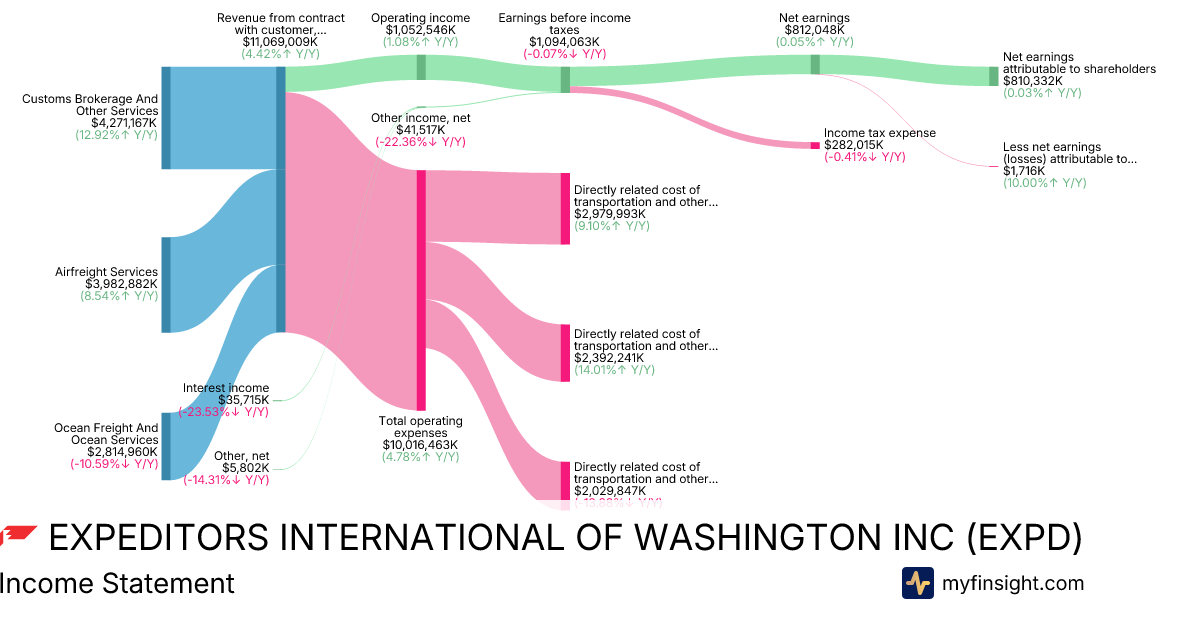 For the year ending 2025-12-31, EXPD made $11,069,009K in revenue. $810,332K in net income. Net profit margin of 7.32%.