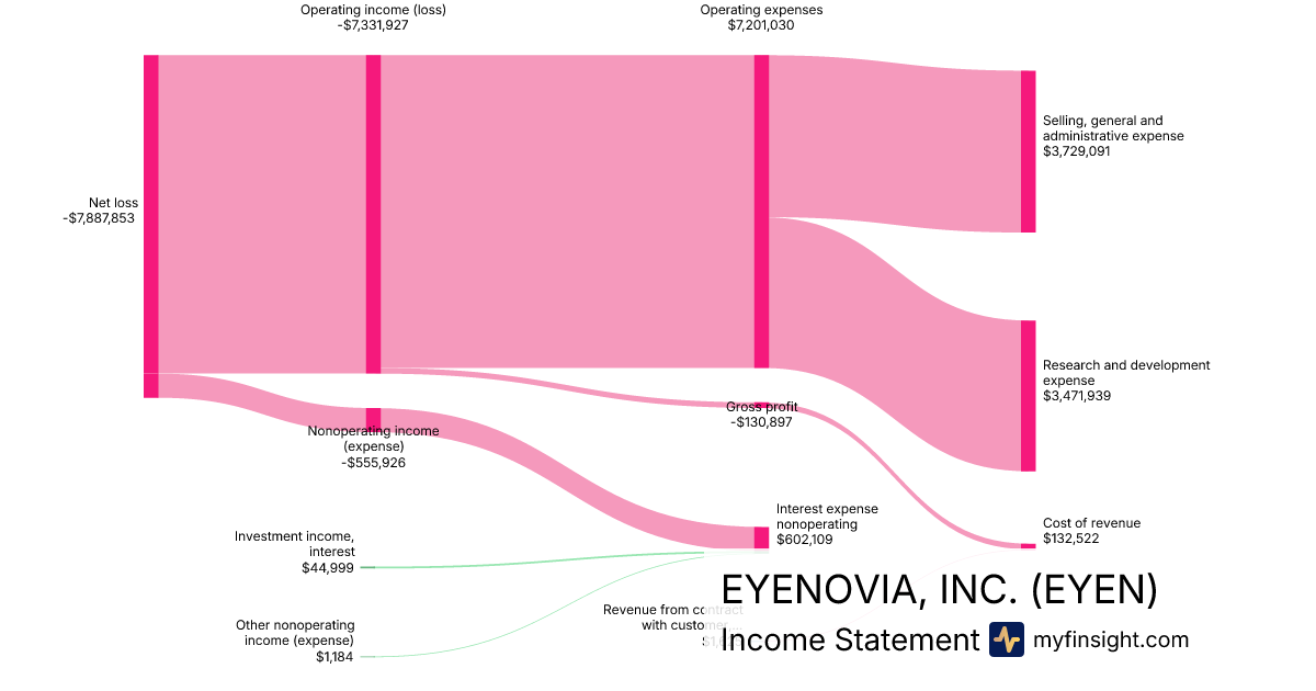 For the quarter ending 2024-09-30, EYEN made $1,625 in revenue. -$7,887,853 in net income. Net profit margin of -485406.34%.