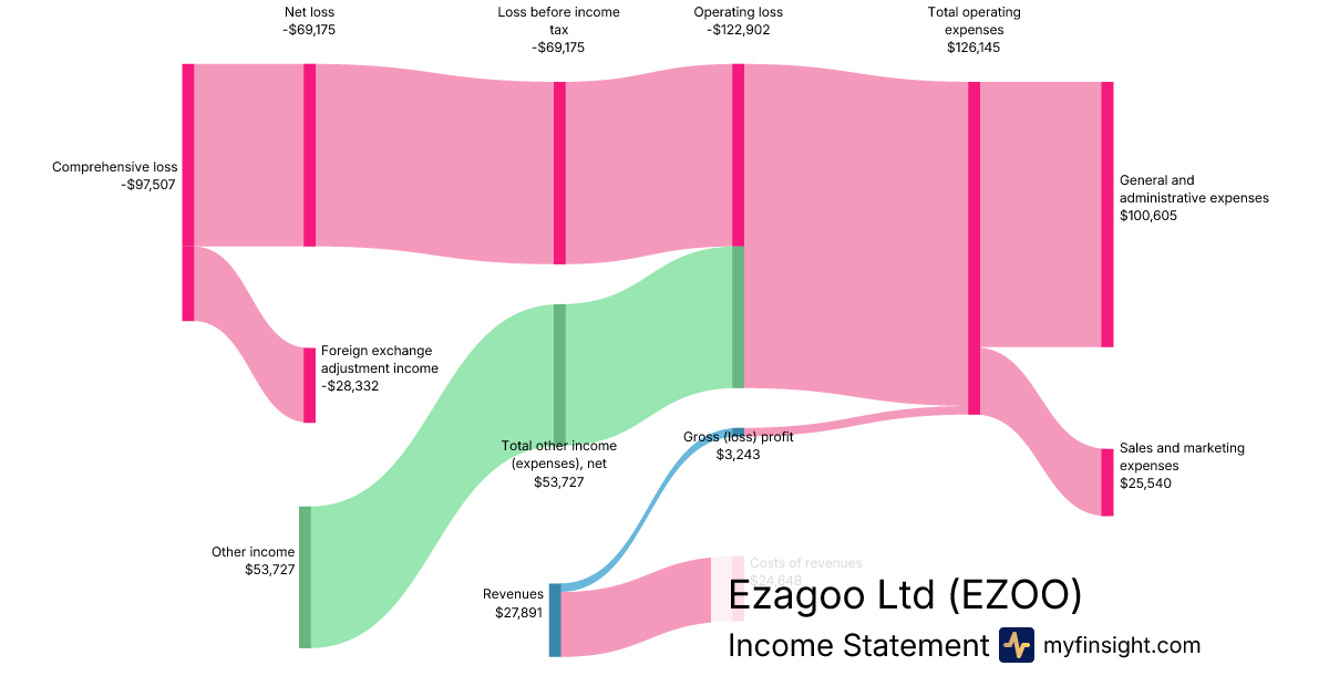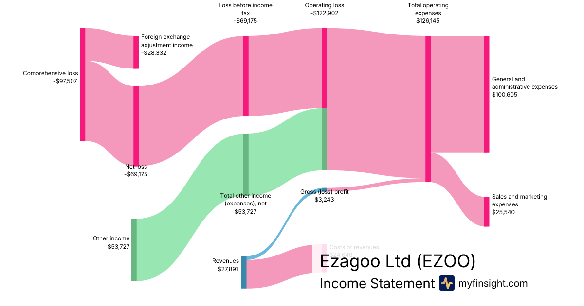 For the quarter ending 2025-09-30, EZOO made $27,891 in revenue. -$97,507 in net income. Net profit margin of -349.60%.