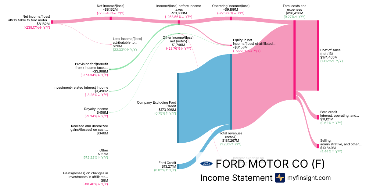 For the year ending 2025-12-31, F made $187,267M in revenue. -$8,182M in net income. Net profit margin of -4.37%.