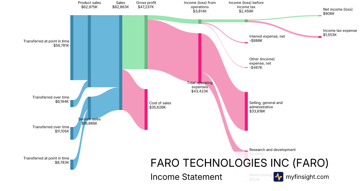 For the quarter ending 2025-03-31, FARO made $82,863K in revenue. $906K in net income. Net profit margin of 1.09%.