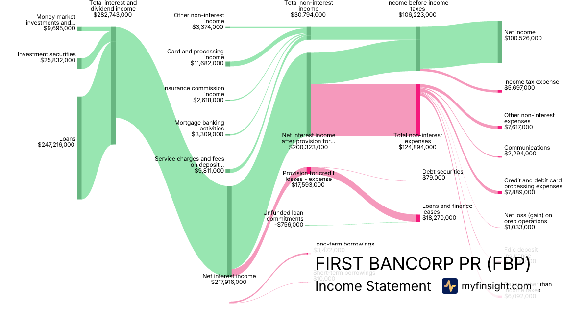 For the quarter ending 2025-09-30, FBP made $521,607,000 in revenue. $100,526,000 in net income. Net profit margin of 19.27%.