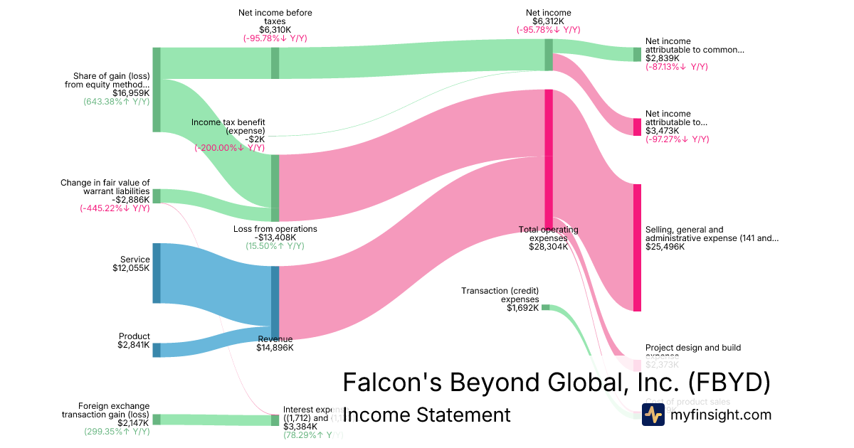 For the year ending 2025-12-31, FBYD made $14,896K in revenue. $2,839K in net income. Net profit margin of 19.06%.
