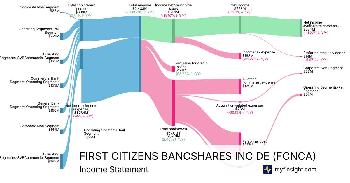 For the quarter ending 2025-09-30, FCNCA made $2,433M in revenue. $554M in net income. Net profit margin of 22.77%.