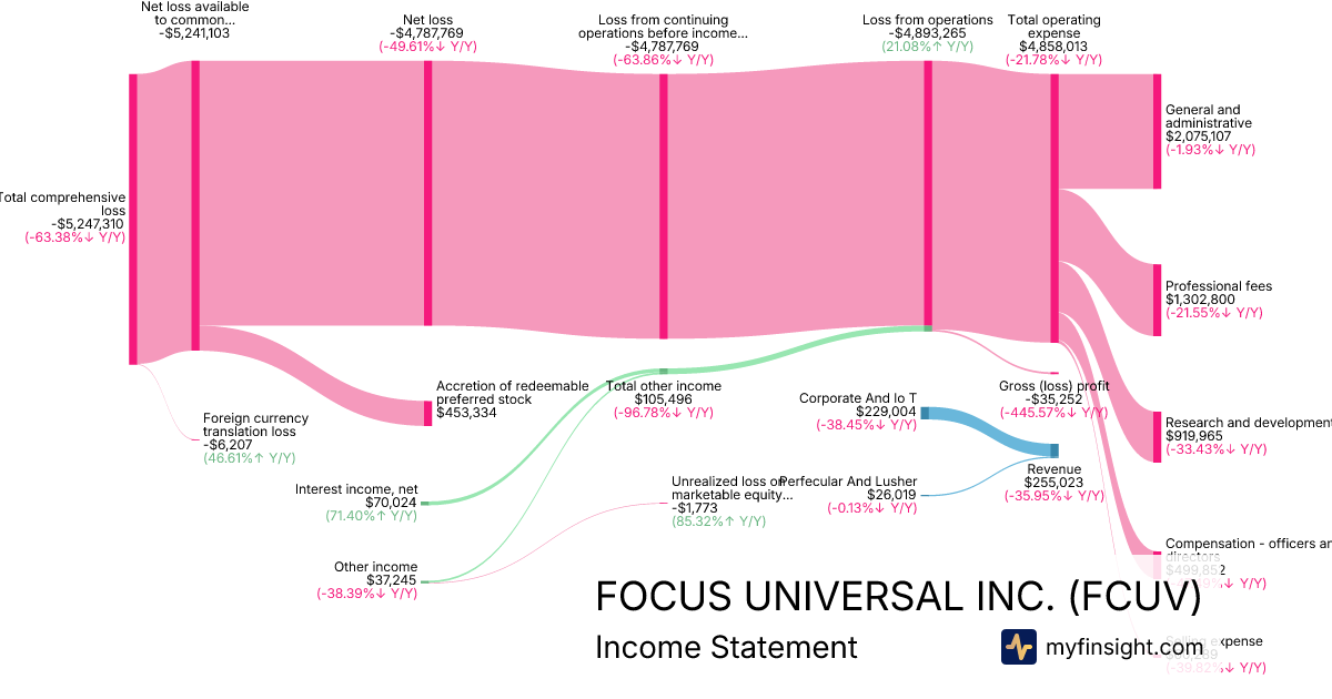 For the year ending 2025-12-31, FCUV made $255,023 in revenue. -$5,247,310 in net income. Net profit margin of -2057.58%.