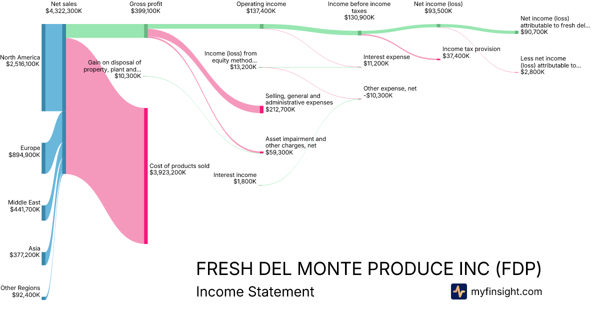 For the year ending 2025-12-26, FDP made $4,322,300K in revenue. $90,700K in net income. Net profit margin of 2.10%.