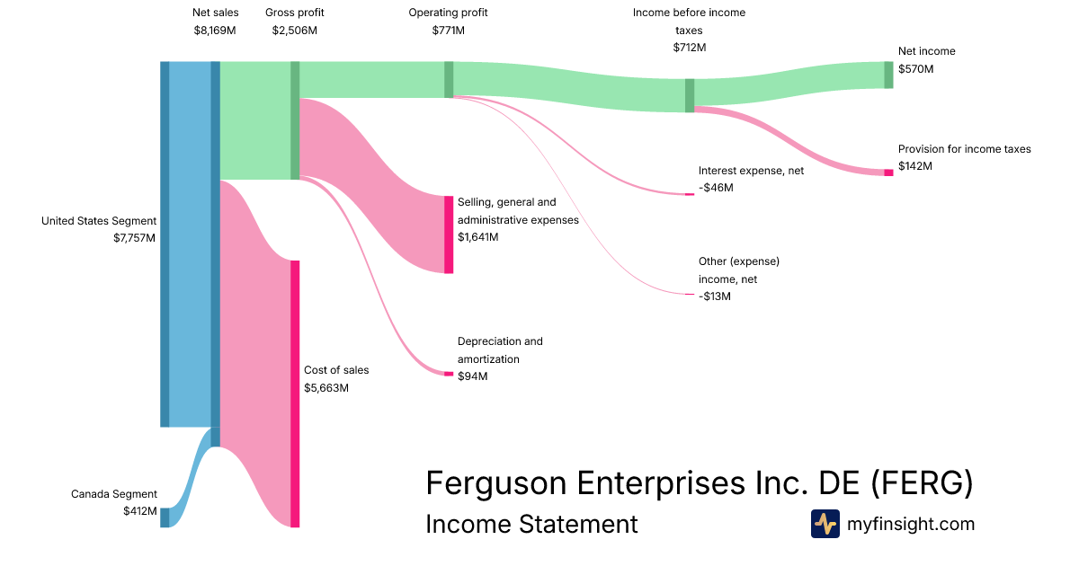 For the quarter ending 2025-10-31, FERG made $8,169M in revenue. $570M in net income. Net profit margin of 6.98%.