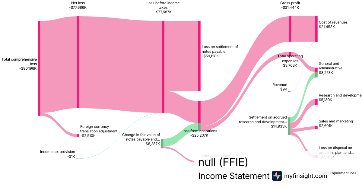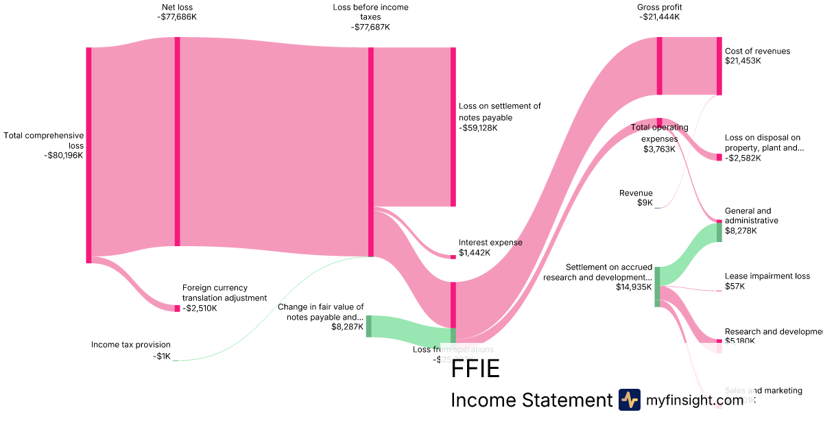 For the quarter ending 2024-09-30, FFIE made $9K in revenue. -$80,196K in net income. Net profit margin of -891066.67%.