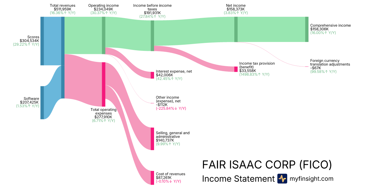 For the quarter ending 2025-12-31, FICO made $511,959K in revenue. $158,306K in net income. Net profit margin of 30.92%.