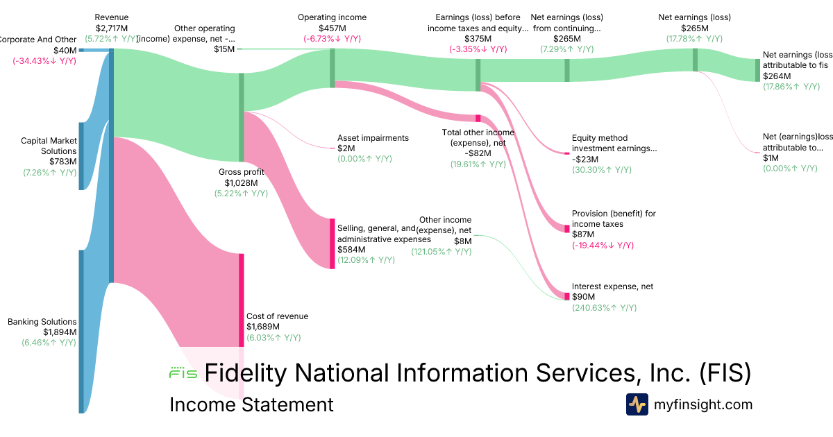 For the quarter ending 2025-09-30, FIS made $2,717M in revenue. $264M in net income. Net profit margin of 9.72%.
