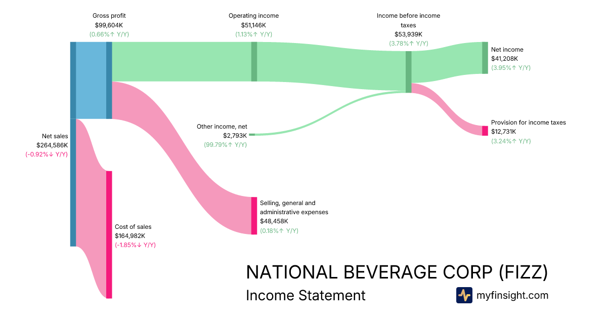 For the quarter ending 2026-01-31, FIZZ made $264,586K in revenue. $41,208K in net income. Net profit margin of 15.57%.
