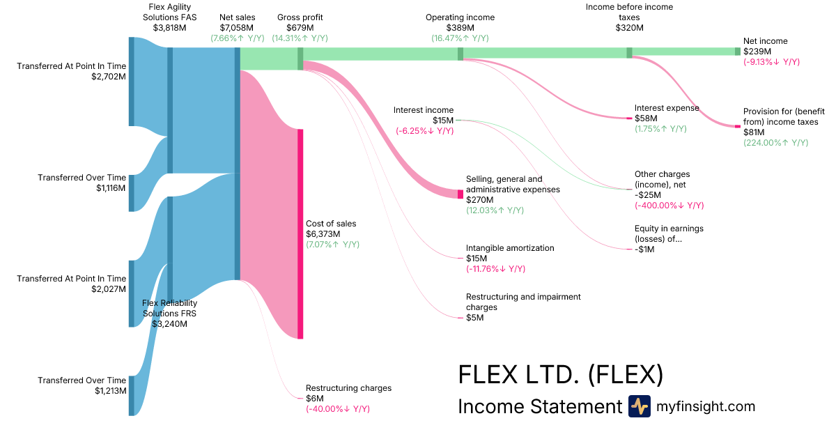 For the quarter ending 2025-12-31, FLEX made $7,058M in revenue. $239M in net income. Net profit margin of 3.39%.