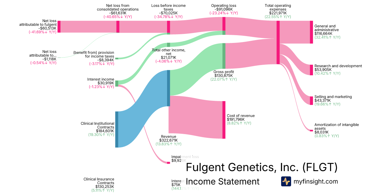 For the year ending 2025-12-31, FLGT made $322,671K in revenue. -$60,513K in net income. Net profit margin of -18.75%.