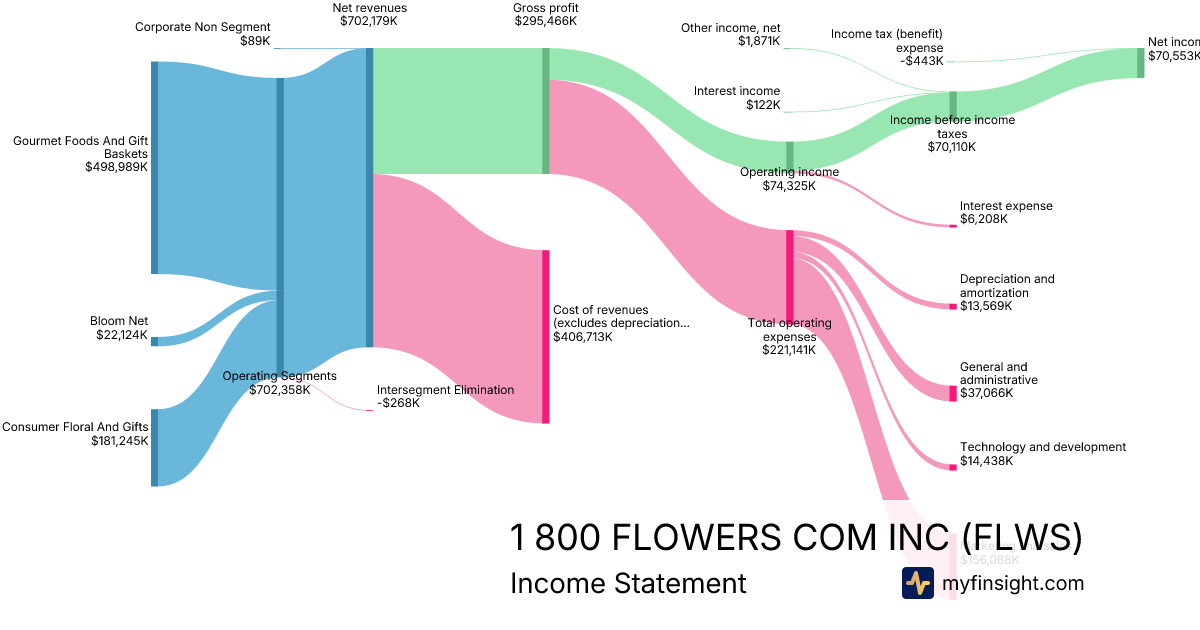 For the quarter ending 2025-12-28, FLWS made $924,870K in revenue. $70,553K in net income. Net profit margin of 7.63%.