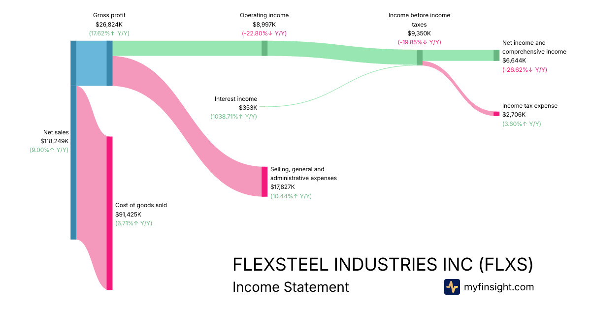 For the quarter ending 2025-12-31, FLXS made $118,249K in revenue. $6,644K in net income. Net profit margin of 5.62%.