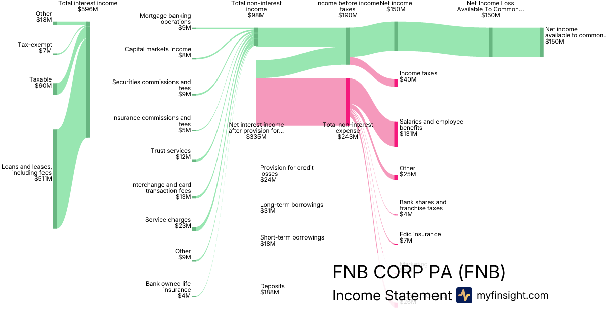 For the quarter ending 2025-09-30, FNB made $1,174M in revenue. $150M in net income. Net profit margin of 12.78%.