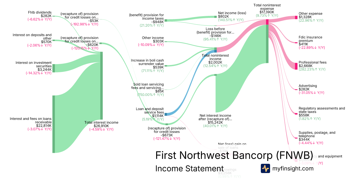 For the quarter ending 2025-09-30, FNWB made $57,734K in revenue. $802K in net income. Net profit margin of 1.39%.