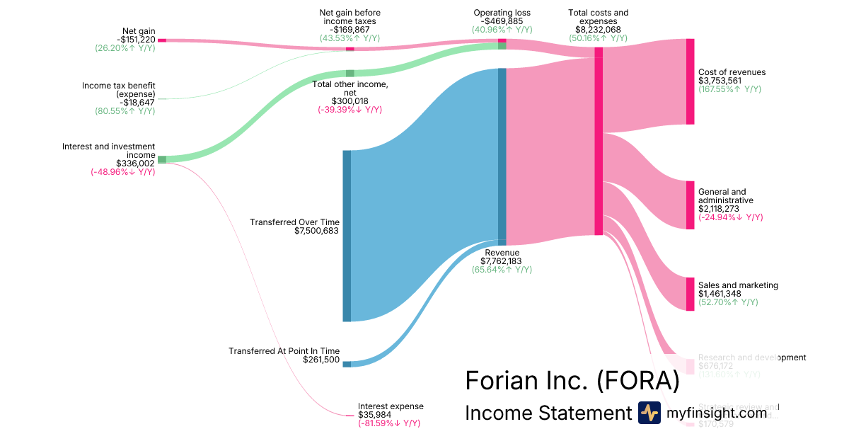 For the quarter ending 2025-09-30, FORA made $7,762,183 in revenue. -$151,220 in net income. Net profit margin of -1.95%.