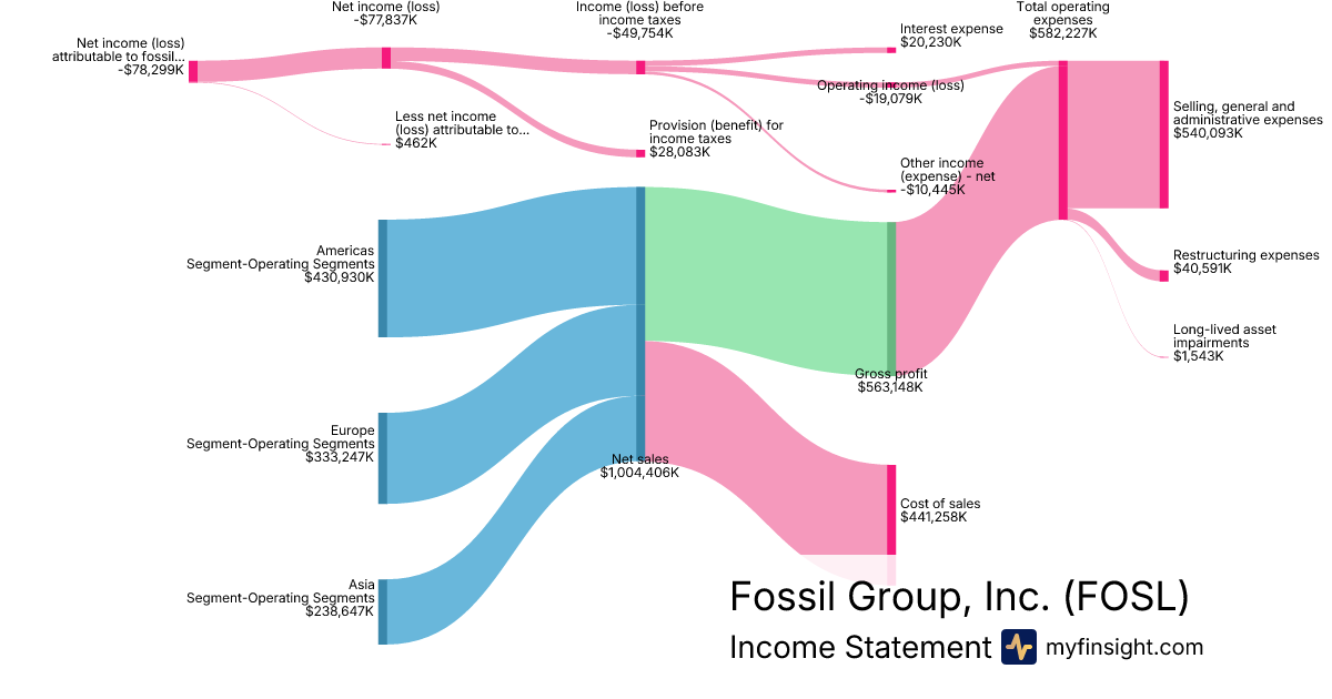 For the year ending 2026-01-03, FOSL made $1,004,406K in revenue. -$78,299K in net income. Net profit margin of -7.80%.