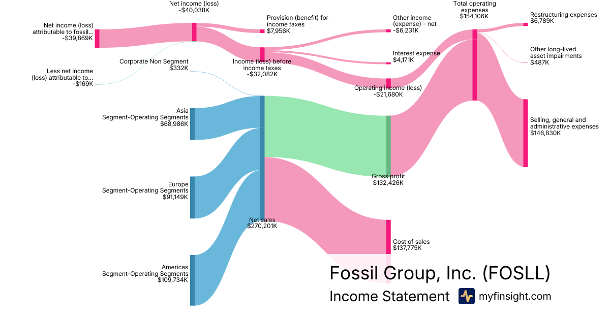 For the quarter ending 2025-10-04, FOSLL made $270,201K in revenue. -$39,869K in net income. Net profit margin of -14.76%.