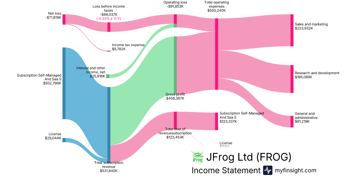 For the year ending 2025-12-31, FROG made $531,840K in revenue. -$71,819K in net income. Net profit margin of -13.50%.