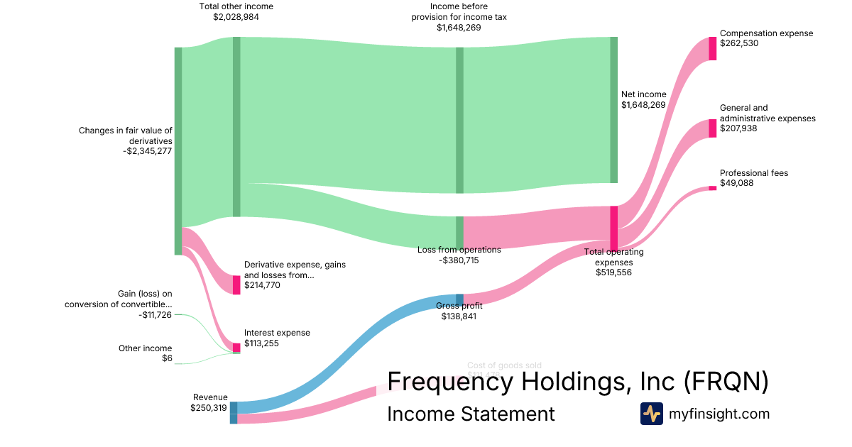 For the quarter ending 2025-09-30, FRQN made $250,319 in revenue. $1,648,269 in net income. Net profit margin of 658.47%.