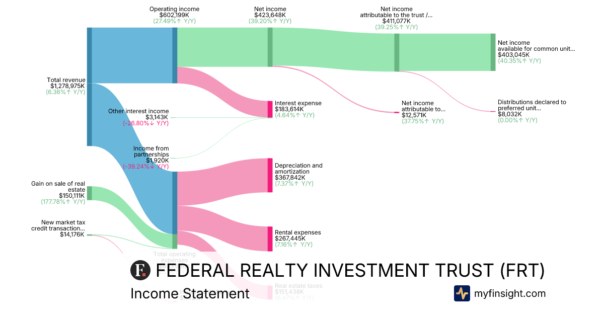 For the year ending 2025-12-31, FRT made $1,278,975K in revenue. $403,045K in net income. Net profit margin of 31.51%.