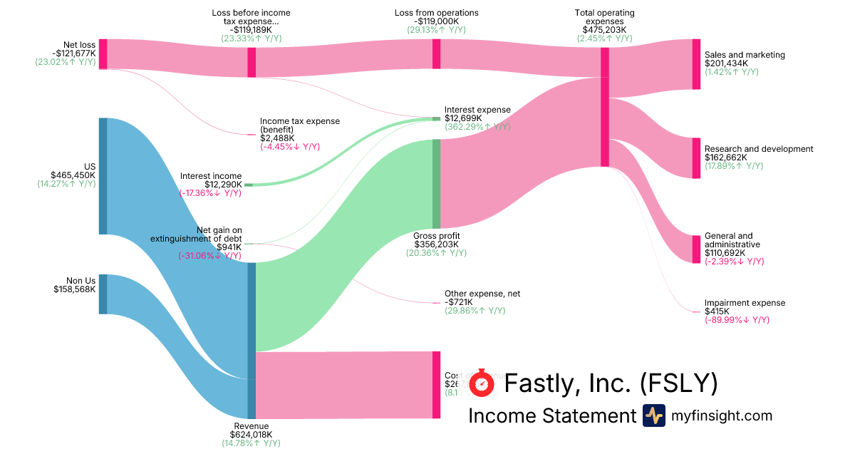 For the year ending 2025-12-31, FSLY made $624,018K in revenue. -$121,677K in net income. Net profit margin of -19.50%.