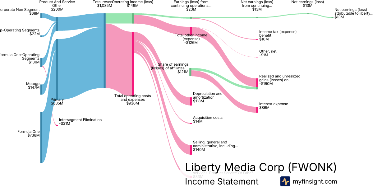 For the quarter ending 2025-09-30, FWONK made $1,085M in revenue. $13M in net income. Net profit margin of 1.20%.