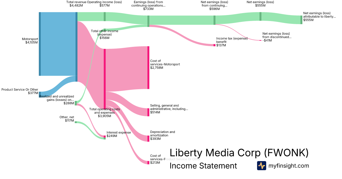 For the year ending 2025-12-31, FWONK made $4,482M in revenue. $555M in net income. Net profit margin of 12.38%.